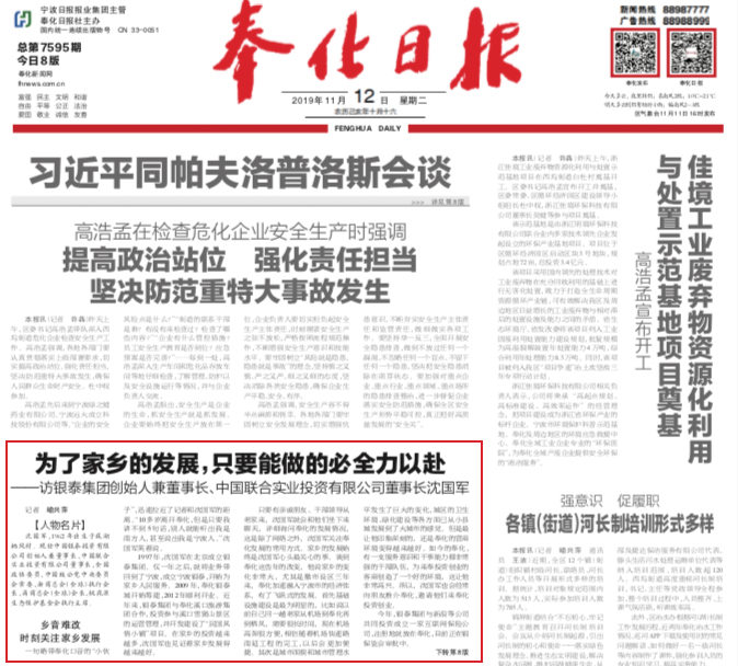 In the interview by Ningbo Daily – Yongpai at the beginning of November, 2019, just before Fenghua Municipal People’s Congress, Ningbo, Mr. Shen Guojun, the founder and Chairman of Yintai Group and Chairman of China United Industry Group Co., Ltd., expressed his keen expectation on the development of his hometown and his resolution and passion to continuously and proactively participate in the construction there.