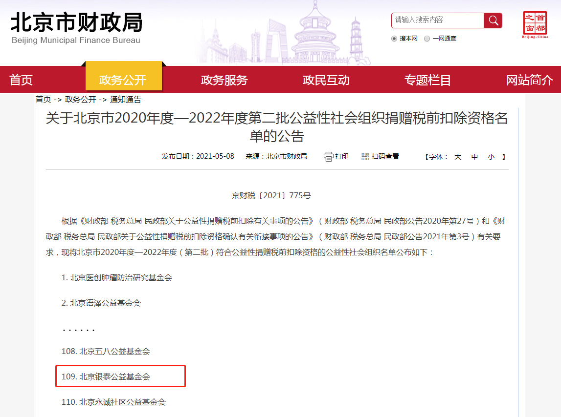 北京銀泰公益基金會(huì )獲得2020-2022年度公益性捐贈稅前扣除資格