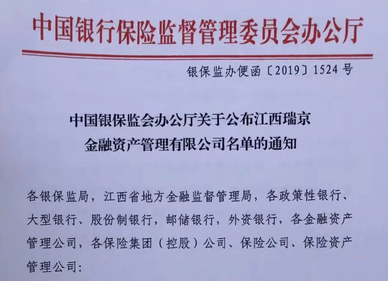10月21日,中國銀保監會(huì )公布地方資產(chǎn)管理公司名單,銀泰集團旗下江西瑞京金融資產(chǎn)管理有限公司獲準開(kāi)展金融不良資產(chǎn)批量收購業(yè)務(wù)。這標志著(zhù)江西省地方金融機構再添新軍,也是自2018年4月以來(lái)全國第一家獲得備案的金融機構。