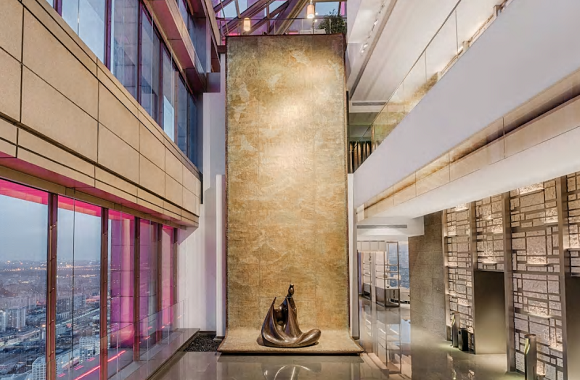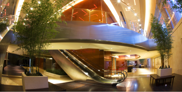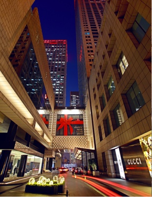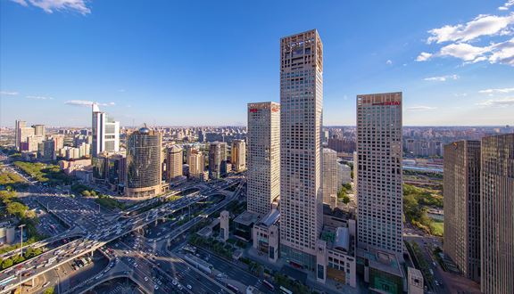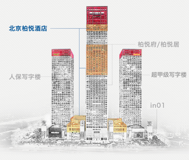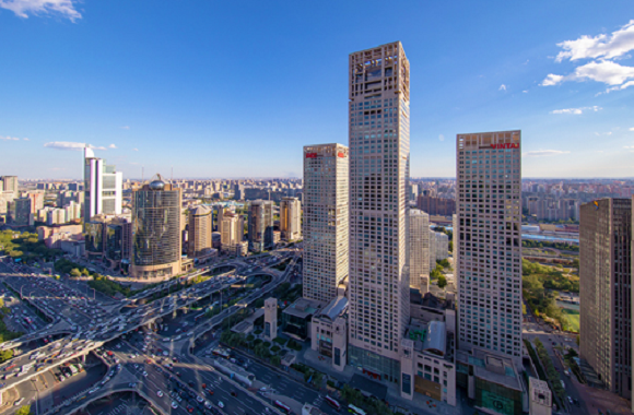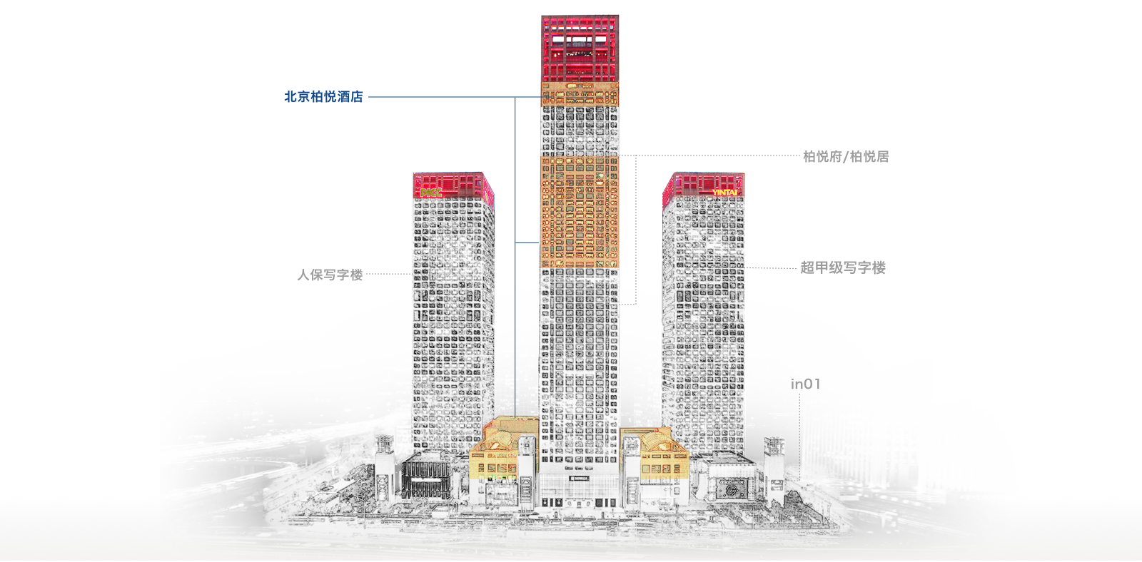地處國貿橋“金十字”的西南角,由美國著(zhù)名建筑大師約翰?波特曼的建筑設計事務(wù)所設計。三座摩天大廈呈“品”字形矗立,中央主樓高達249.9米,是目前長(cháng)安街沿線(xiàn)正式運營(yíng)的最高建筑體,其頂端玻璃金字塔的框架結構仿照中國燈籠設計,在夜色中大放光芒,如同“中國燈籠照亮CBD”。北京銀泰中心整體由北京柏悅酒店(Park Hyatt Beijing)、專(zhuān)屬府邸式公寓柏悅府、現代豪華公寓柏悅居、高端購物中心in01和2棟超甲級寫(xiě)字樓組成,是國際概念的高品位商業(yè)、休閑、健康、美食及娛樂(lè )生活的目的地。