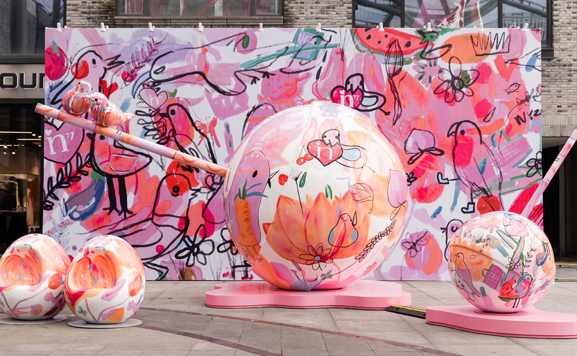 有8米寬4米高的巨型棒棒糖裝置空降西湖邊,還有鮮花市集、鮮花電梯、鮮花音樂(lè )會(huì )等活動(dòng)營(yíng)造甜蜜氣氛。通過(guò)藝術(shù)家的小鳥(niǎo)與花朵的涂鴉元素,營(yíng)造繁花似錦的春天氣息,引來(lái)無(wú)數顧客慕名前來(lái)打卡拍照,在杭州商業(yè)中又掀起了新一輪的情人節熱潮。