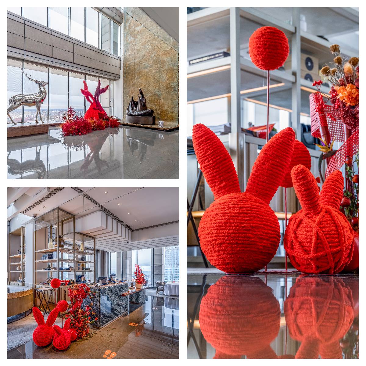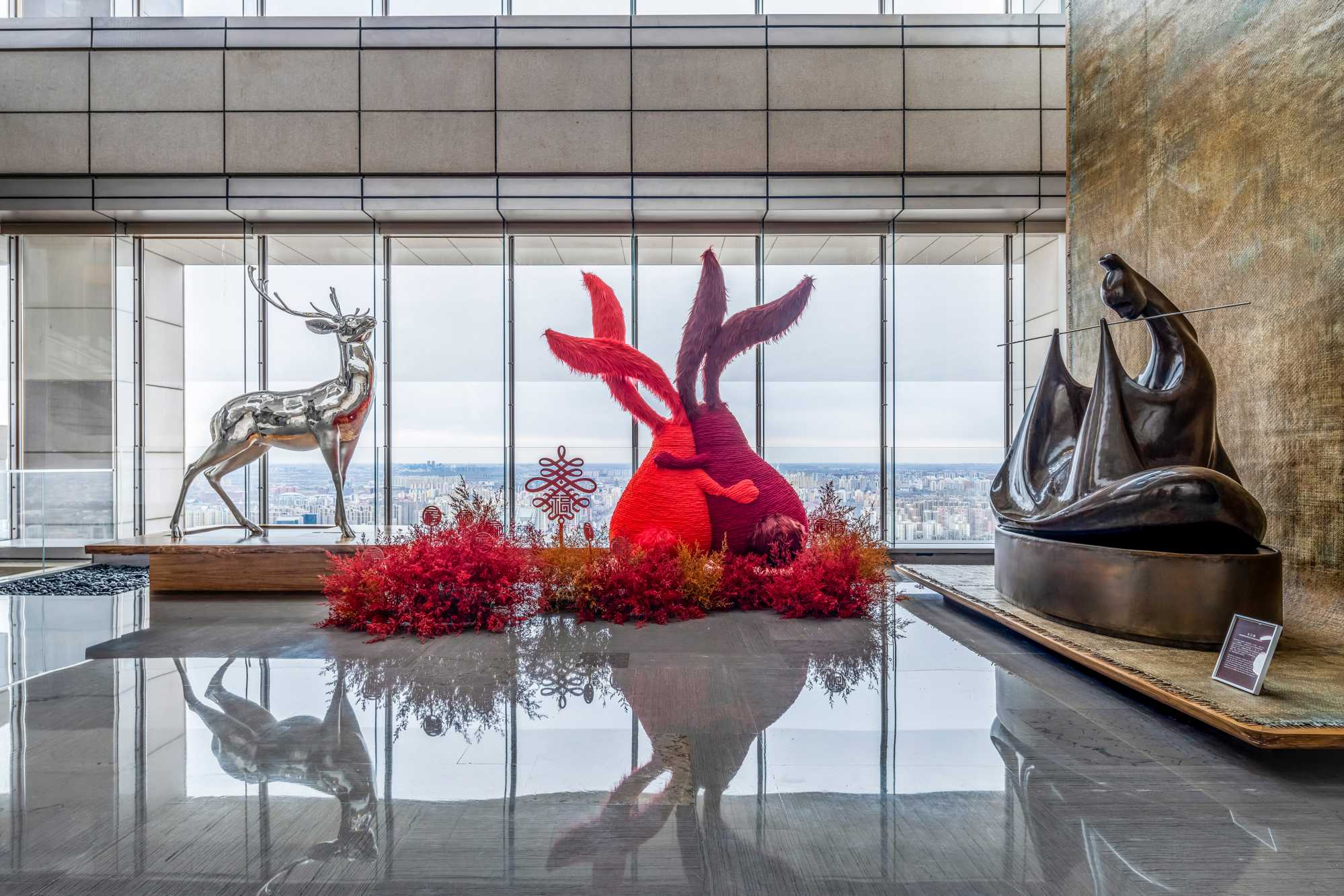 在北京柏悅酒店63層空中大堂,映入眼簾的就是一對毛絨絨的陪伴兔,在花海中相互依偎著(zhù)望向窗外,俯瞰北京國貿CBD的風(fēng)景,給賓客帶來(lái)溫馨和陪伴的感覺(jué)。